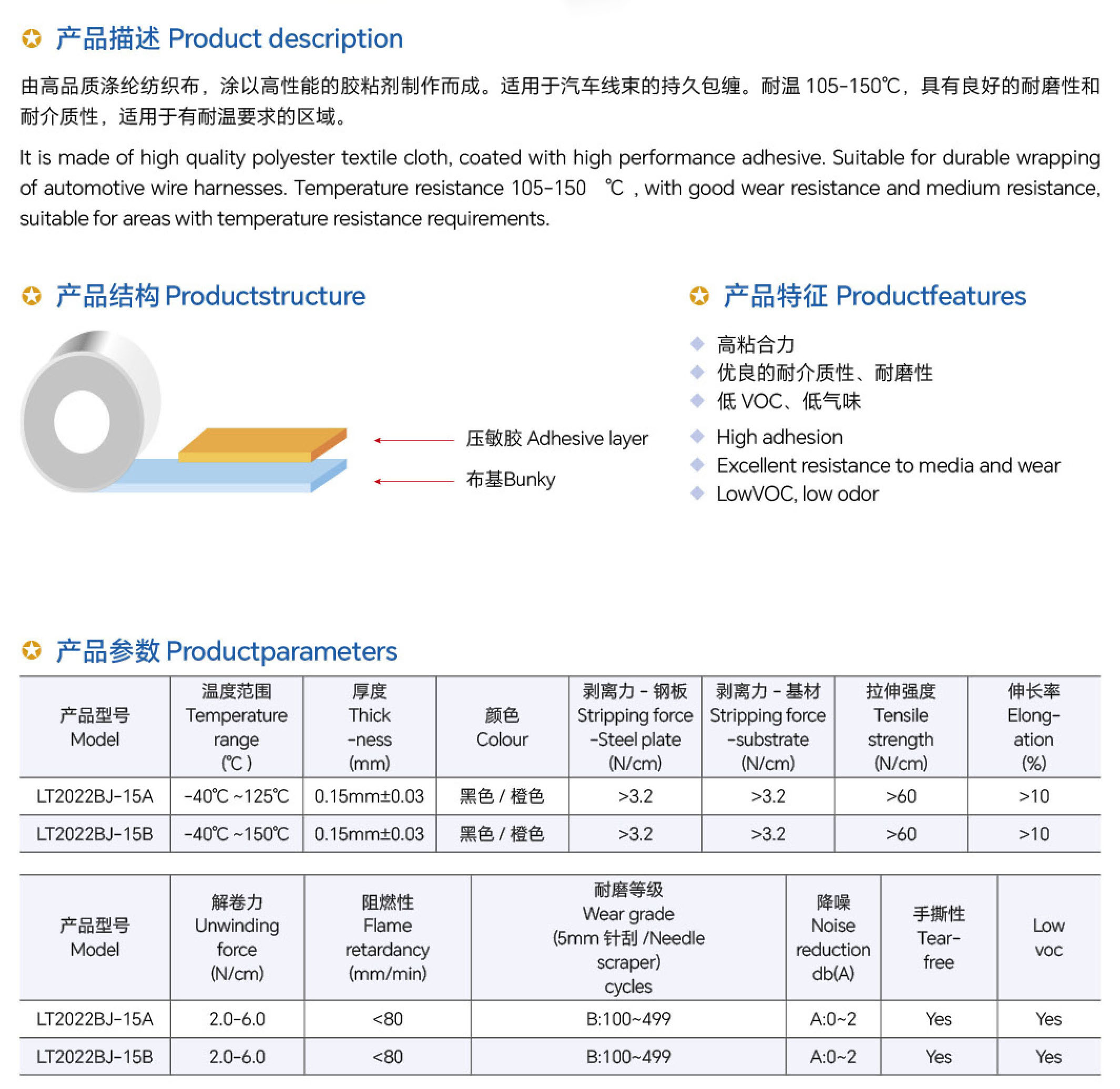 由高品質(zhì)滌綸紡織布,涂以高性能的膠粘劑制作而成。適用于汽車線束的持久包纏。耐溫105-150℃,具有良好的耐磨性和耐介質(zhì)性,適用于有耐溫要求的區(qū)域。